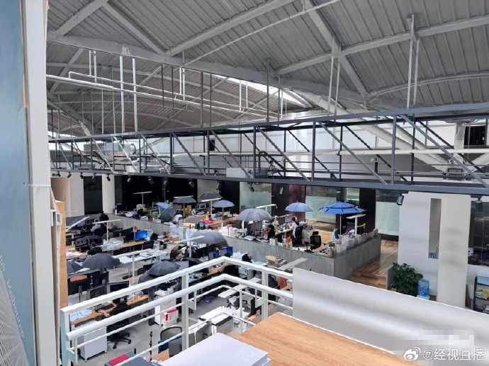 网友提供的图片显示,涉事区域为顶楼办公区,楼顶设有透明玻璃采光区。阳光透过玻璃直射部分工位,有员工在被照射的工位上撑开了遮阳伞,在伞下办公。发帖者解释,打伞并非因漏水,而是阳光直射影响员工看电脑屏幕,“主要是为了遮阳”。